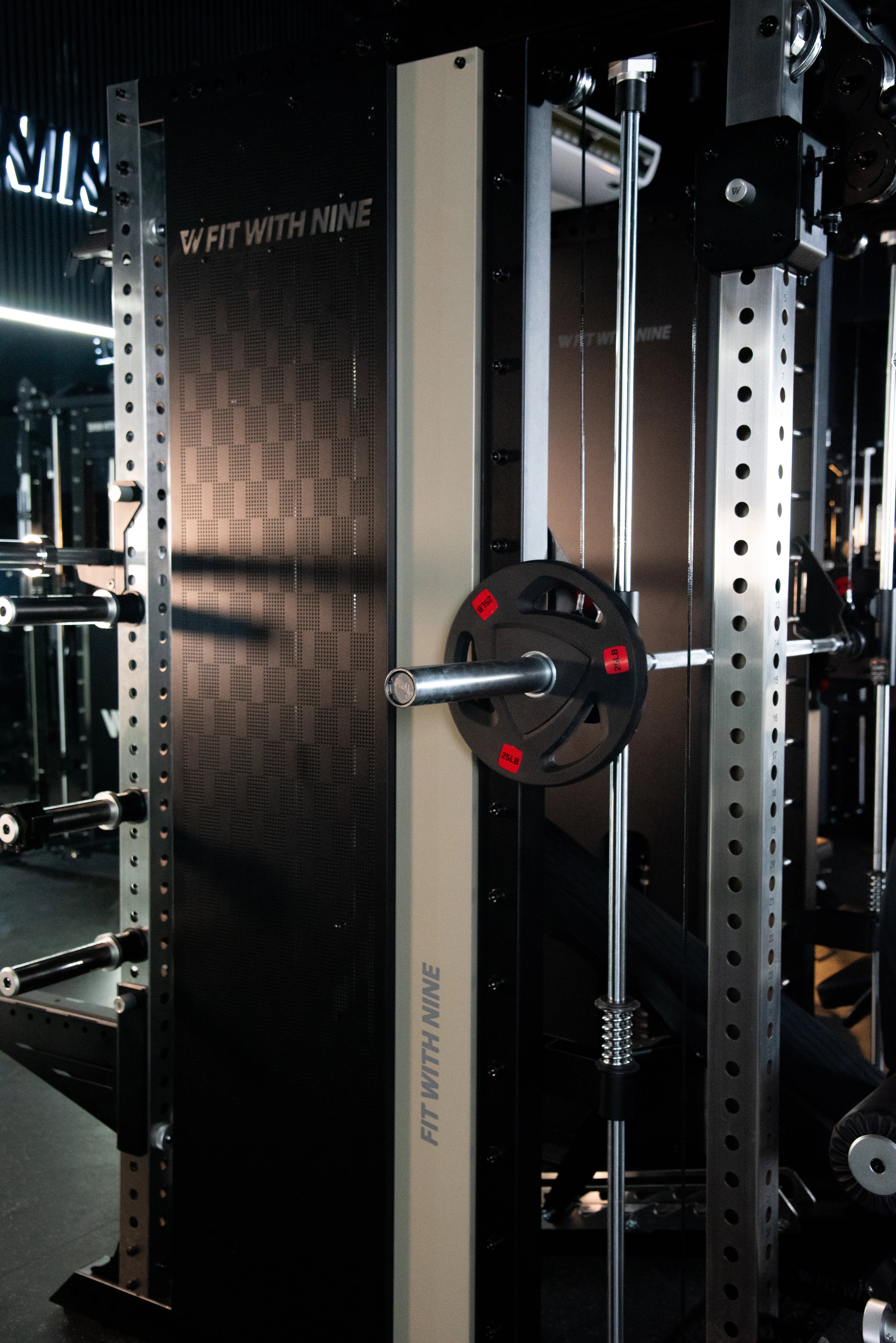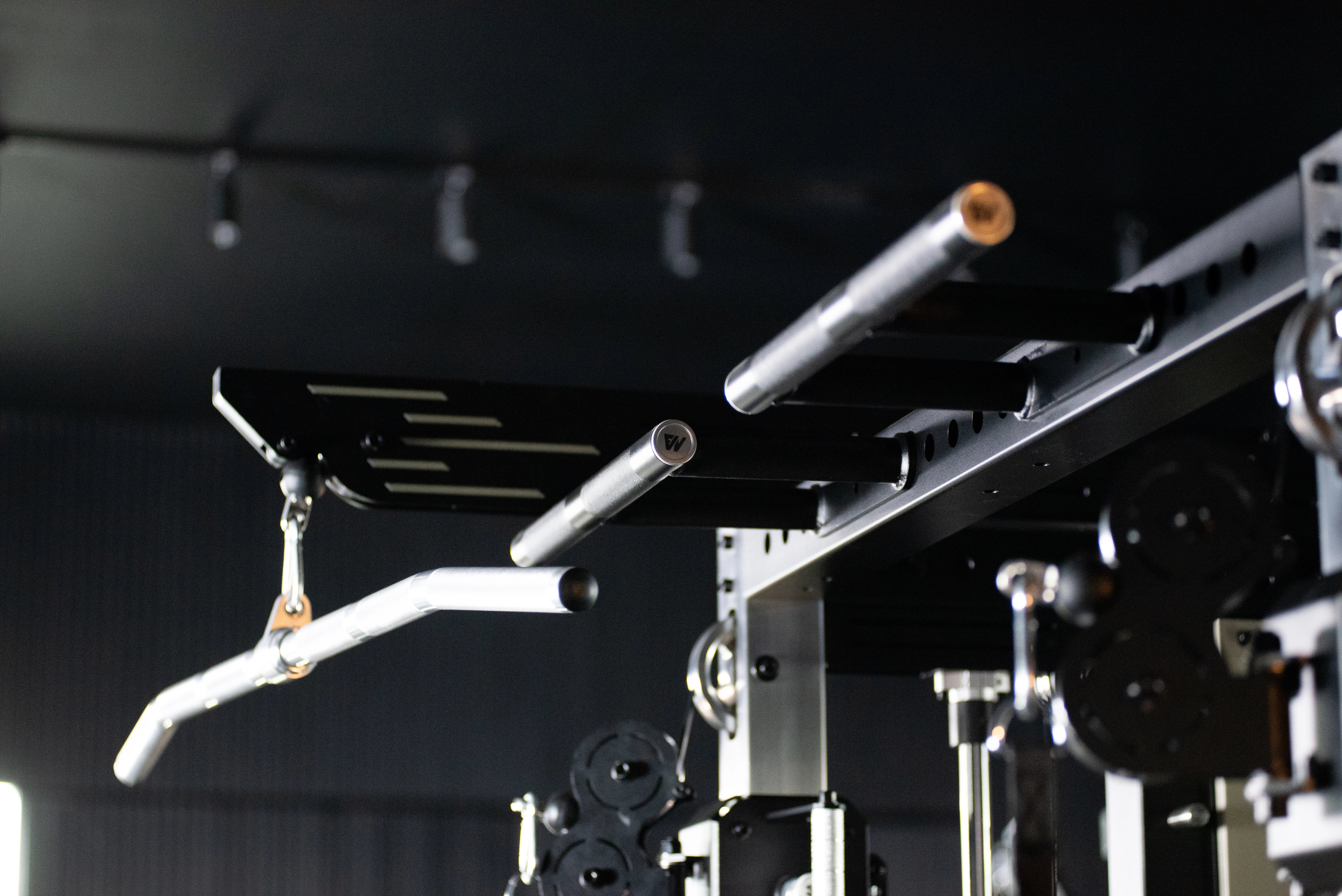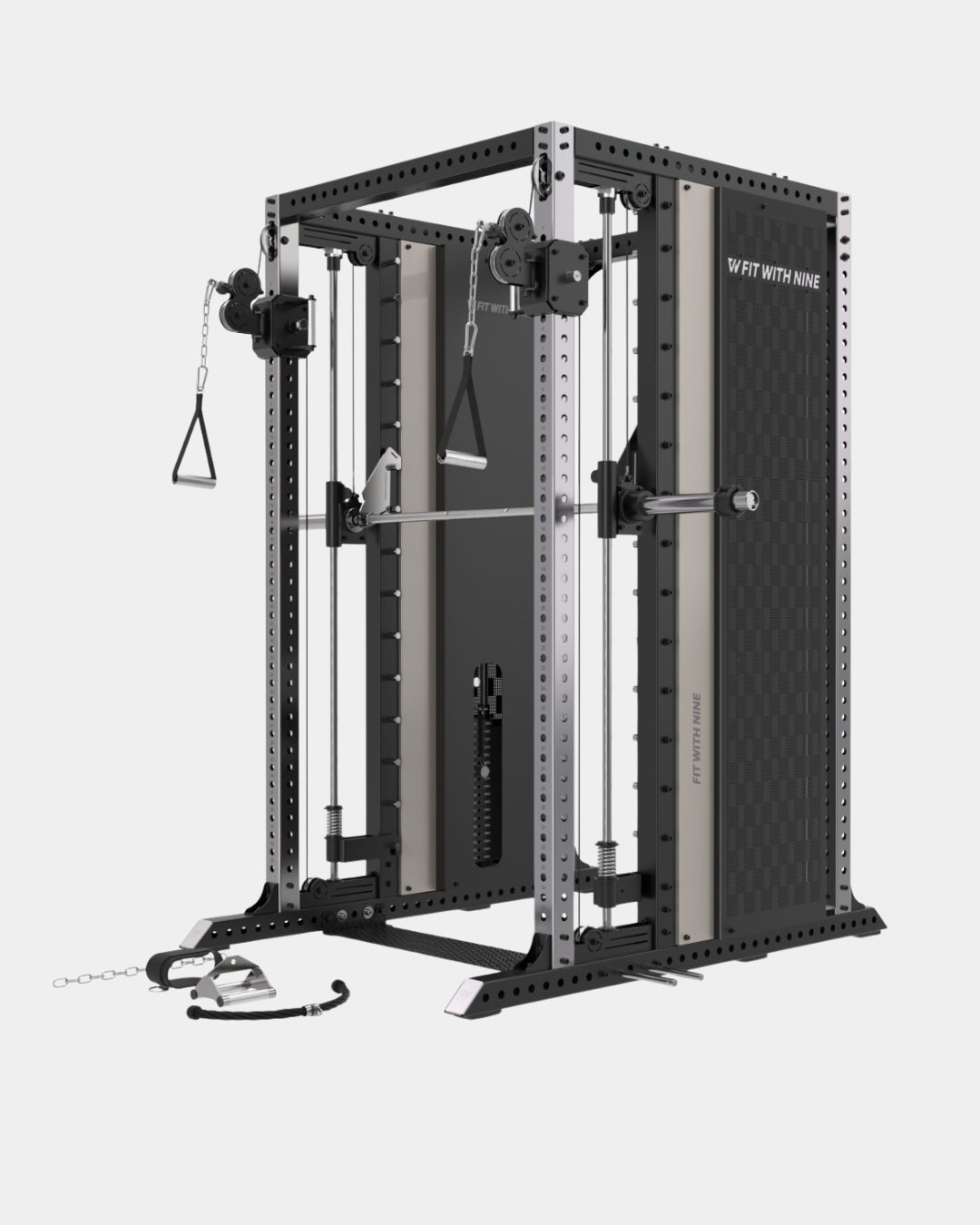 - Aditamentos premium incluidos (landmine, dip bar, poleas, barra olímpica, banco profesional).