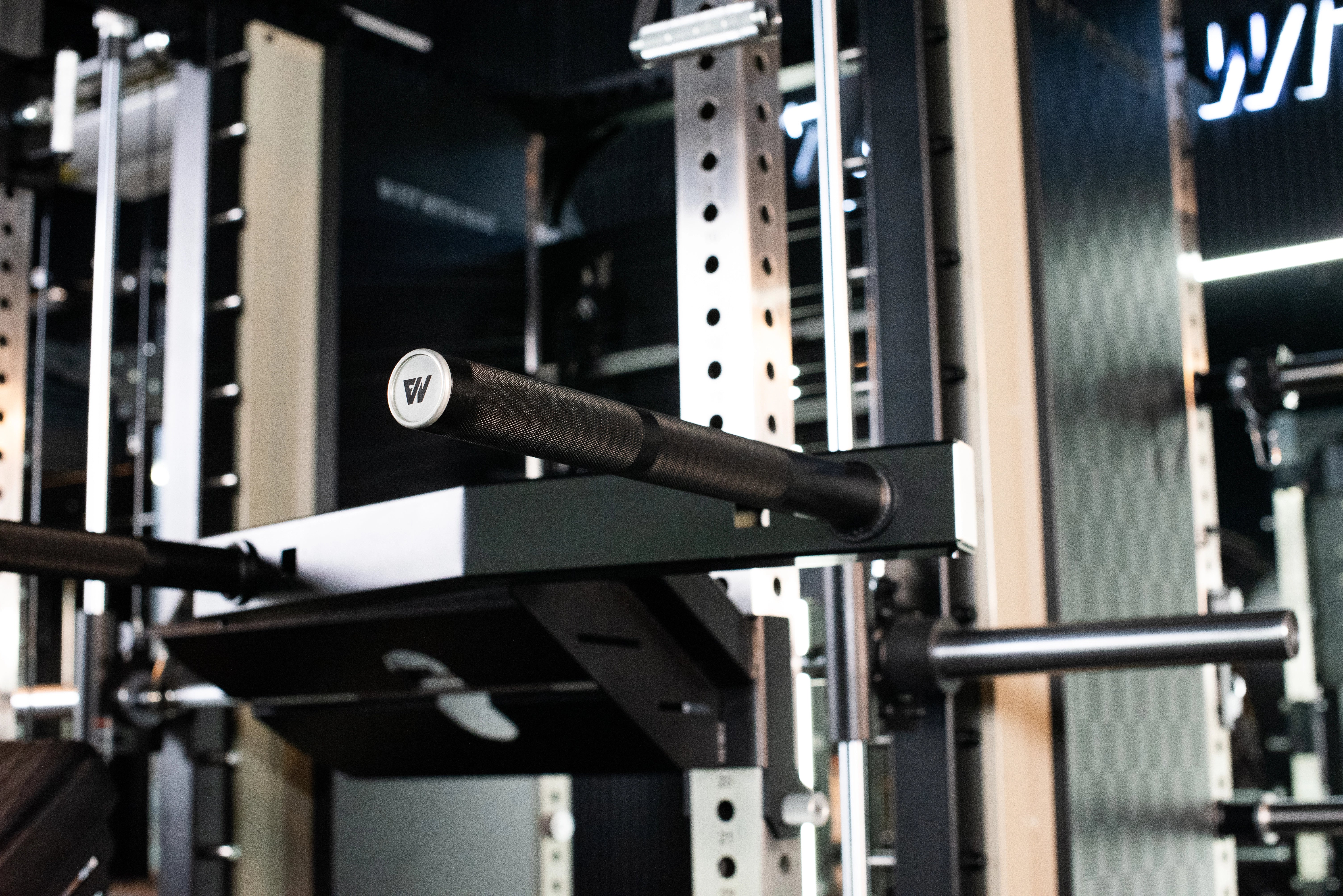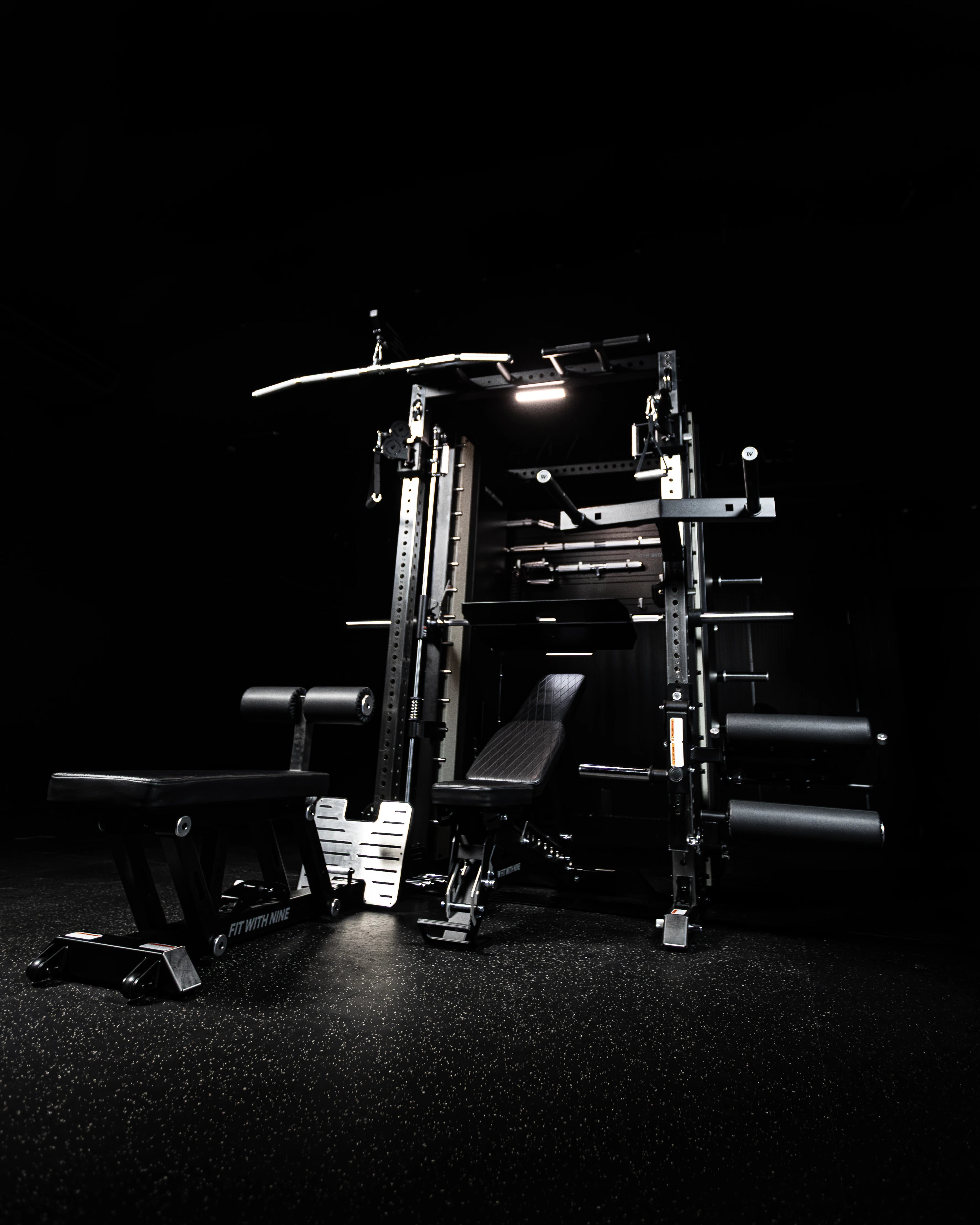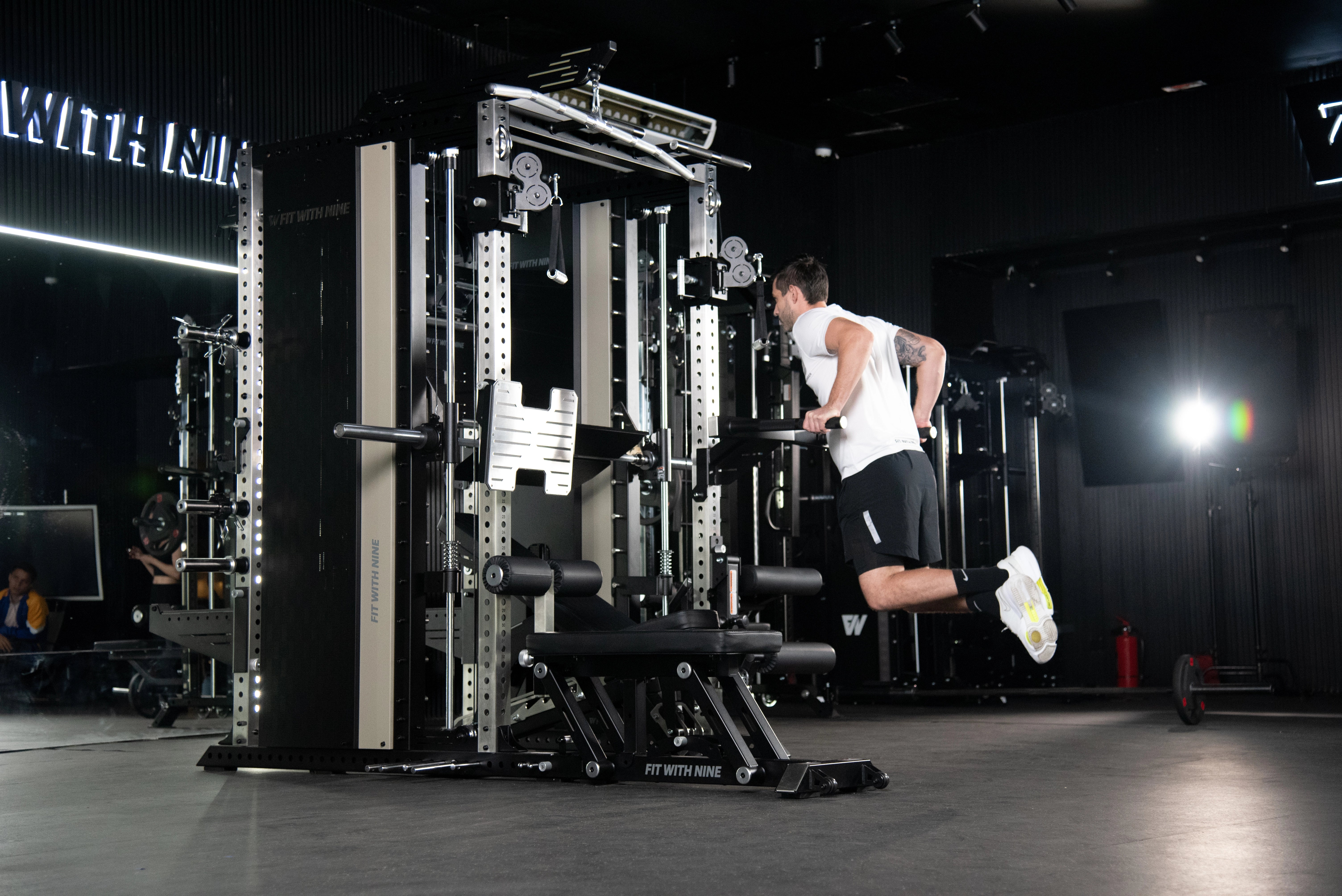 - Aditamentos premium incluidos (landmine, dip bar, poleas, barra olímpica, banco profesional).